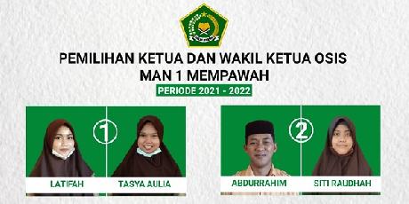HUMASMANSAMEMPAWAH. Selasa 02/03/2021 masa bakti OSIS MAN 1 Mempawah periode 2020/2021 telah memasuki masa akhir kepengurusan. Dengan berakhirnya masa kepengurusan OSIS MAN 1 Mempawah, pada hari Selasa 02/03/2021 dilaksanakan proses pemilihan Ketua dan Wakil Ketua OSIS MAN 1 Mempawah Periode 2021/2022. Pada pemilihan kali ini terdapat 2 Pasangan Calon Ketua dan Wakil Ketua OSIS. Adapun Pasan...